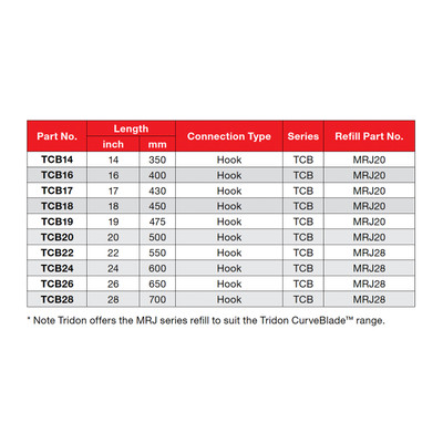 Tridon CurveBlade Range Tridon CurveBlade offers a superior wiper blade with better wiping performance and cleaner vision at high speeds over traditional wiper blades. Direct replacement for vehicles fitted as original equipment. By using integrated curved spring rails, Tridon CurveBlade offers continuous pressure contact on the screen across the length of the blade, ensuring superior wiping performance and increased driver visibility. Hook upgrade program for vehicles manufactured with traditional steel blades. Aerodynamic flat profile design. Modern styling. Advanced rubber technology. Minimal drag on screen. Reduced wind noise. Anti-wind lift at high speed. Easy to install. For correct vehicle CurveBlade selection refer to the vehicle application within the listing or use 'Find My Vehicle'